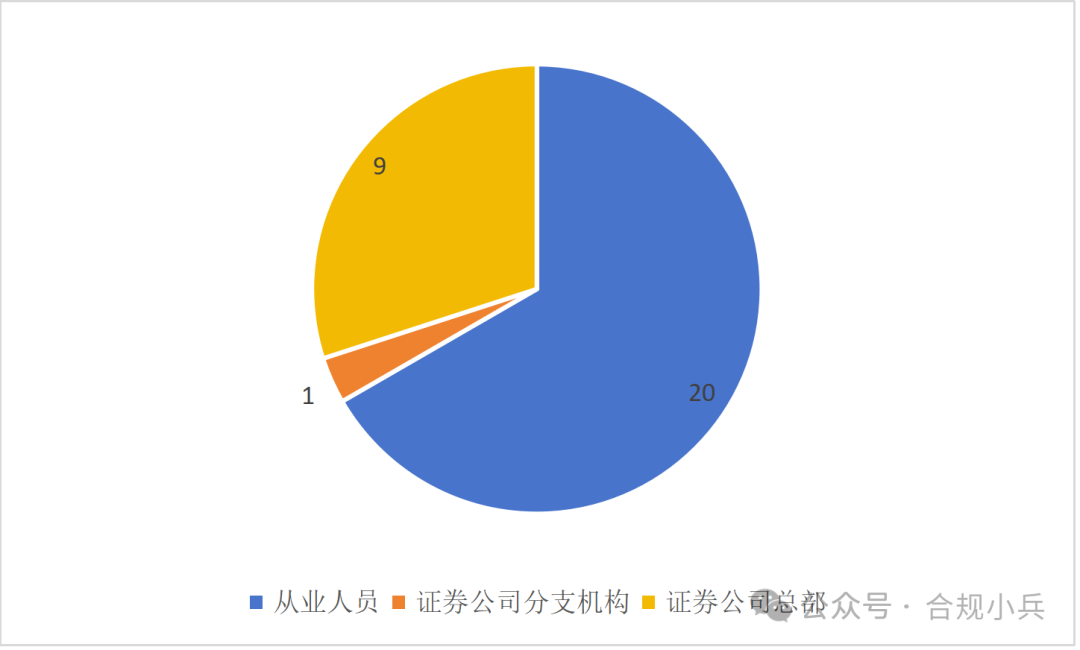 (二)2025年3月,从处罚对象看,涉及机构罚单共10张,涉及9家证券公司(含投行子公司)、1家证券公司分支机构;人员罚单共20张,累计共25名从业人员被处罚(提示:机构和人员出现在同一张罚单的,分别按机构和人员各自一张进行统计;同一张罚单中出现多名人员的,按累计人次进行统计)。具体如下图: