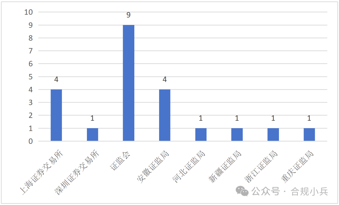 (一)从处罚主体分布来看,中国证监会及地方监管局出具17单,其中,证监会出具9单,安徽证监局出具4单,河北、新疆、浙江、重庆监管局各出具1单;上海证券交易所和深圳证券交易所分别出具4单和1单。具体如下图: